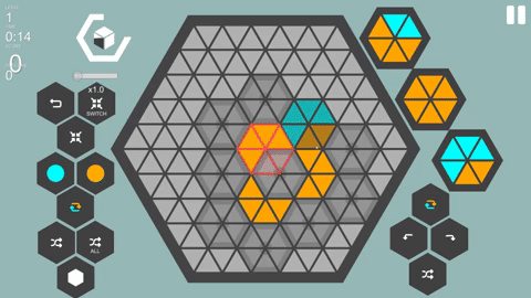 You are given hexagon pieces made up of two different coloured triangles. Rotate them and place them smartly to create hexagons. Create multiple pieces before the timer ring expires for a combo.